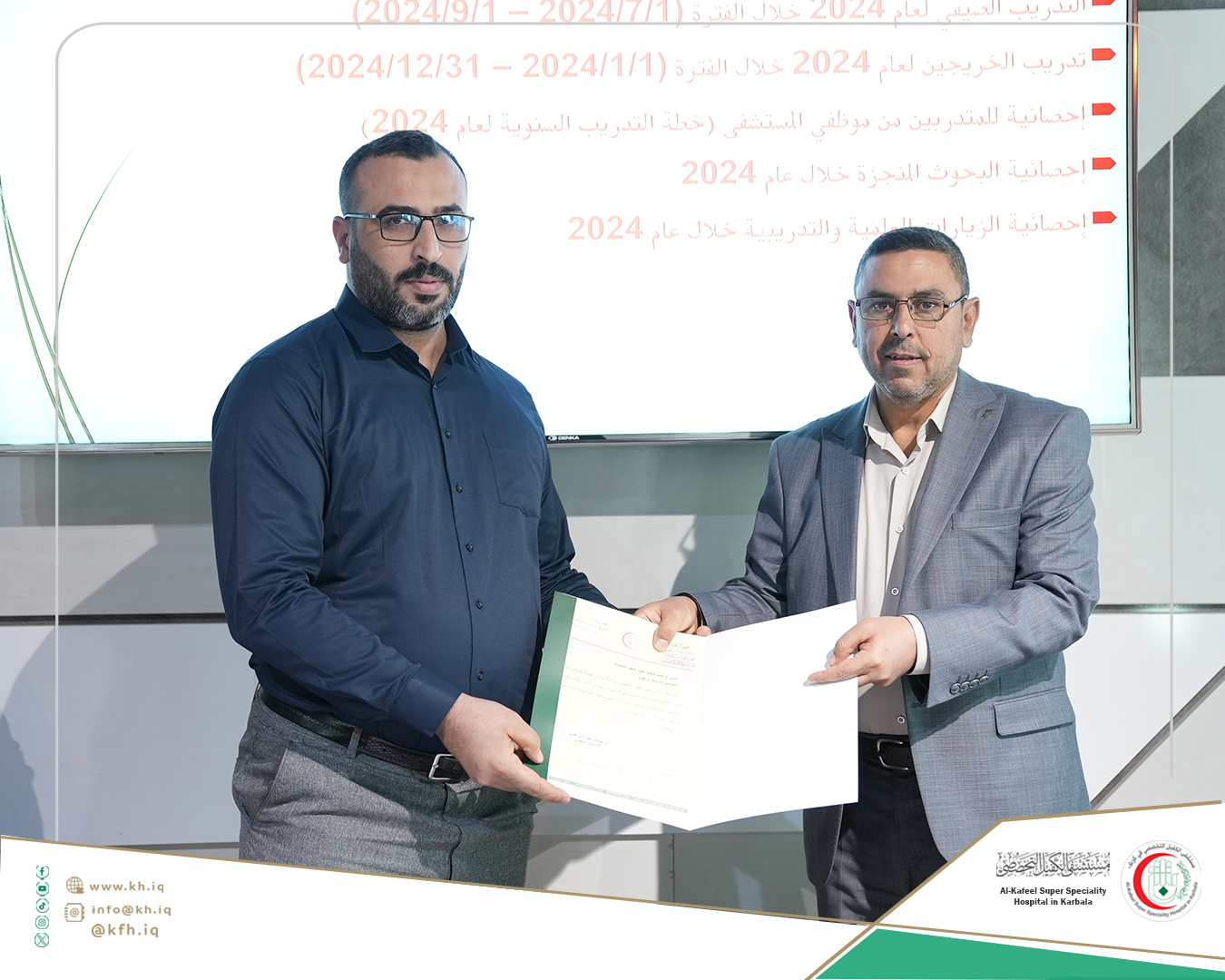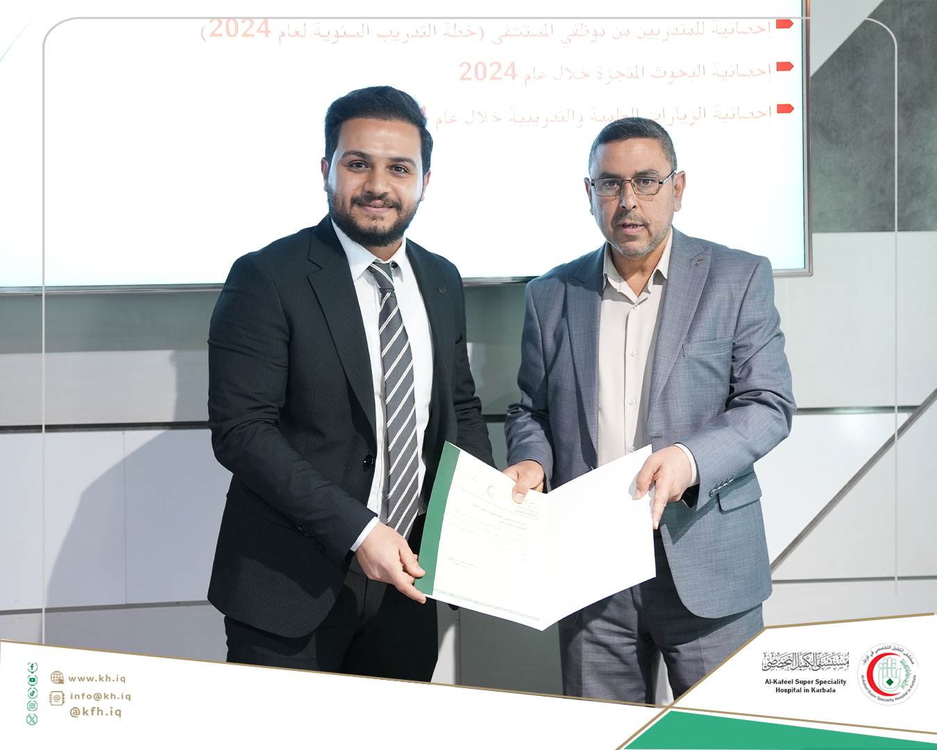 وأضاف النصراوي، إن عدد ممن إشتركوا بتدريباتنا من موظفي المستشفى بلغ (752) موظفاً، تدربوا بنحو (24) تخصصاً ضمن تخصصات أقسام وشعب المستشفى المختلفة، وساهمنا بإنجاز (20) بحثاً أكاديميا في الدراسات الأولية والعليا بتخصصات طبية ومختبرية ومالية وتقنية مختلفة لباحثين من جامعات بغداد وبابل وكربلاء ووارث الأنبياء والزهراء والعميد، إضافة إلى جامعة صفاقص من تونس وجامعة إيران للعلوم الطبية، مردفاً إنه في جانب الزيارات العلمية والتدريبية إستقبلنا (1390) طالباً وطالبة من جامعات وكليات حكومية وأهلية من كربلاء ومحافظات أخرى، بمختلف التخصصات التي ترتبط بتقديم الخدمات في القطاع الصحي.