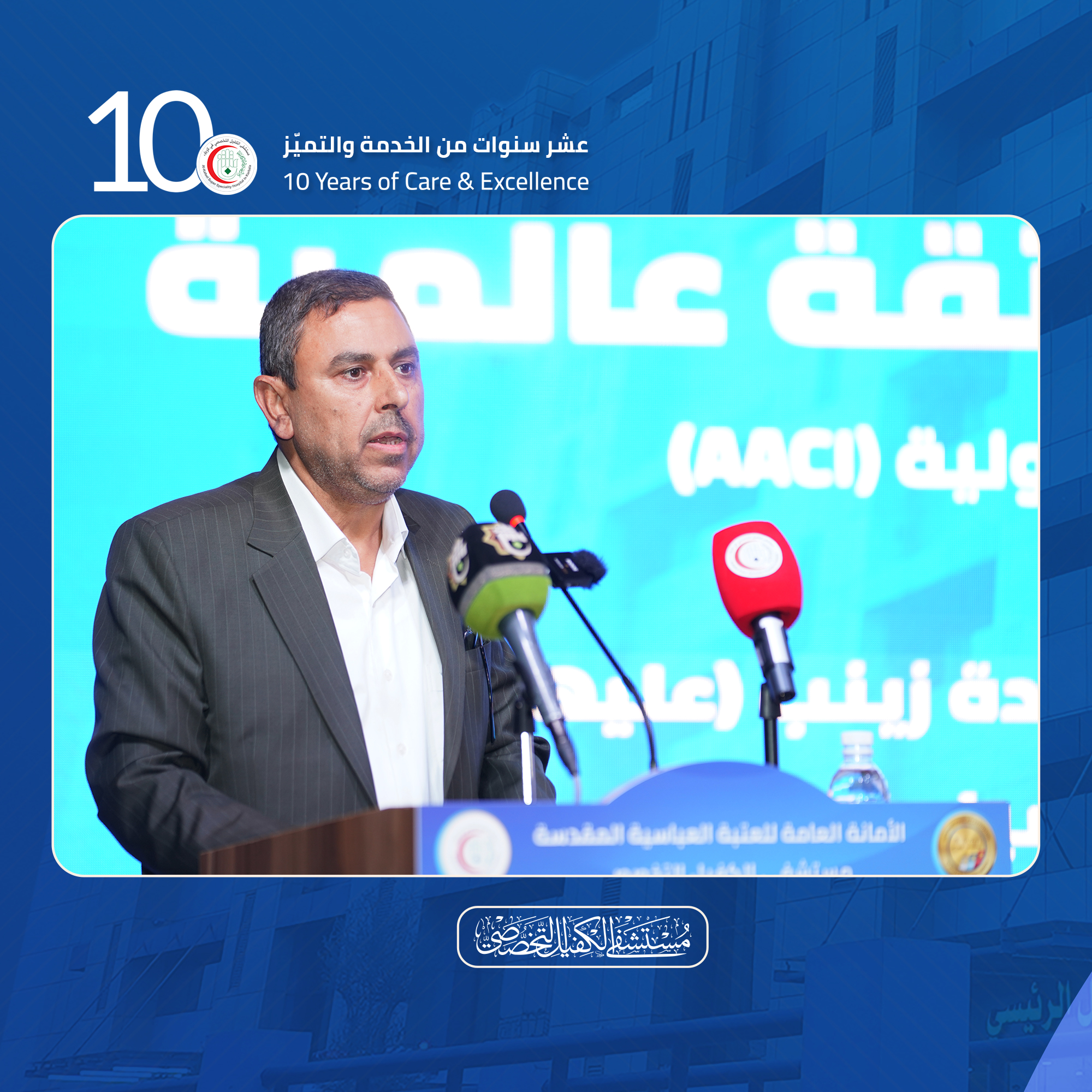 يحتفل بحصوله على شهادة الاعتماد الدولية الخاصة بالجودة وسلامة المرضى، من منظمة AACI الامريكية، وبالتزامن مع ذكرى انطلاقته العاشرة، وذلك بحفل رسمي اقيم مساء اليوم الاثنين، وبحضور ممثلين عن وزارة الصحة ومنظمة AACI الامريكية ورئيس هيئة الصحة بالعتبة الحسينية المقدسة ونقيب اطباء كربلاء وعدد من اعضاء مجلس ادارة العتبة العباسية المقدسة وشخصيات رسمية وطبية ونخبوية من مختلف القطاعات.