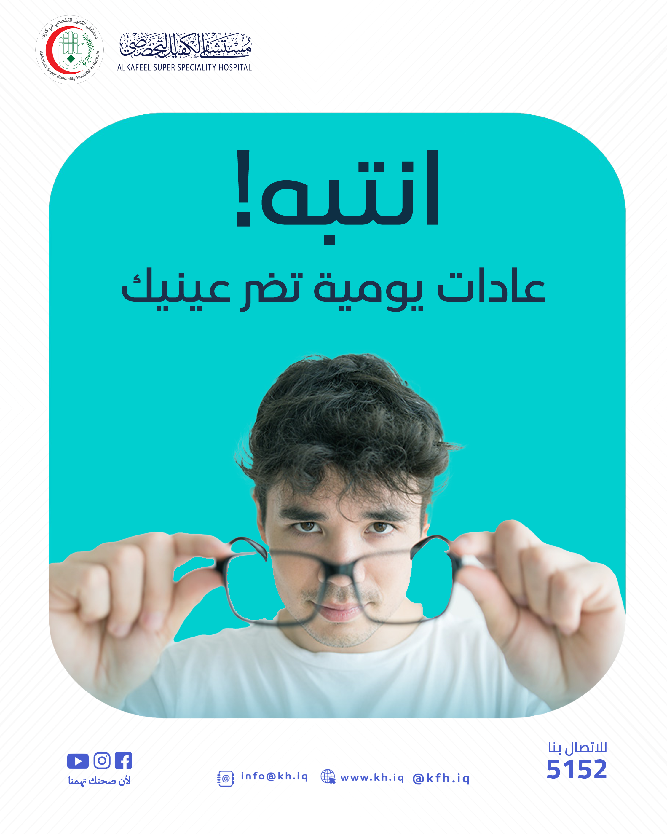 حافظ على صحة عينيك:* خذ استراحة كل 20 دقيقة عند استخدام الهاتف * لا تفرك عينيك لتجنب الالتهابات* تناول أطعمة غنية بفيتامين A مثل الجزر * ارتدِ نظارات شمسية للحماية من الأشعة* افحص عينيك بشكل دوري الوقاية اليوم تحمي نظرك غدًا