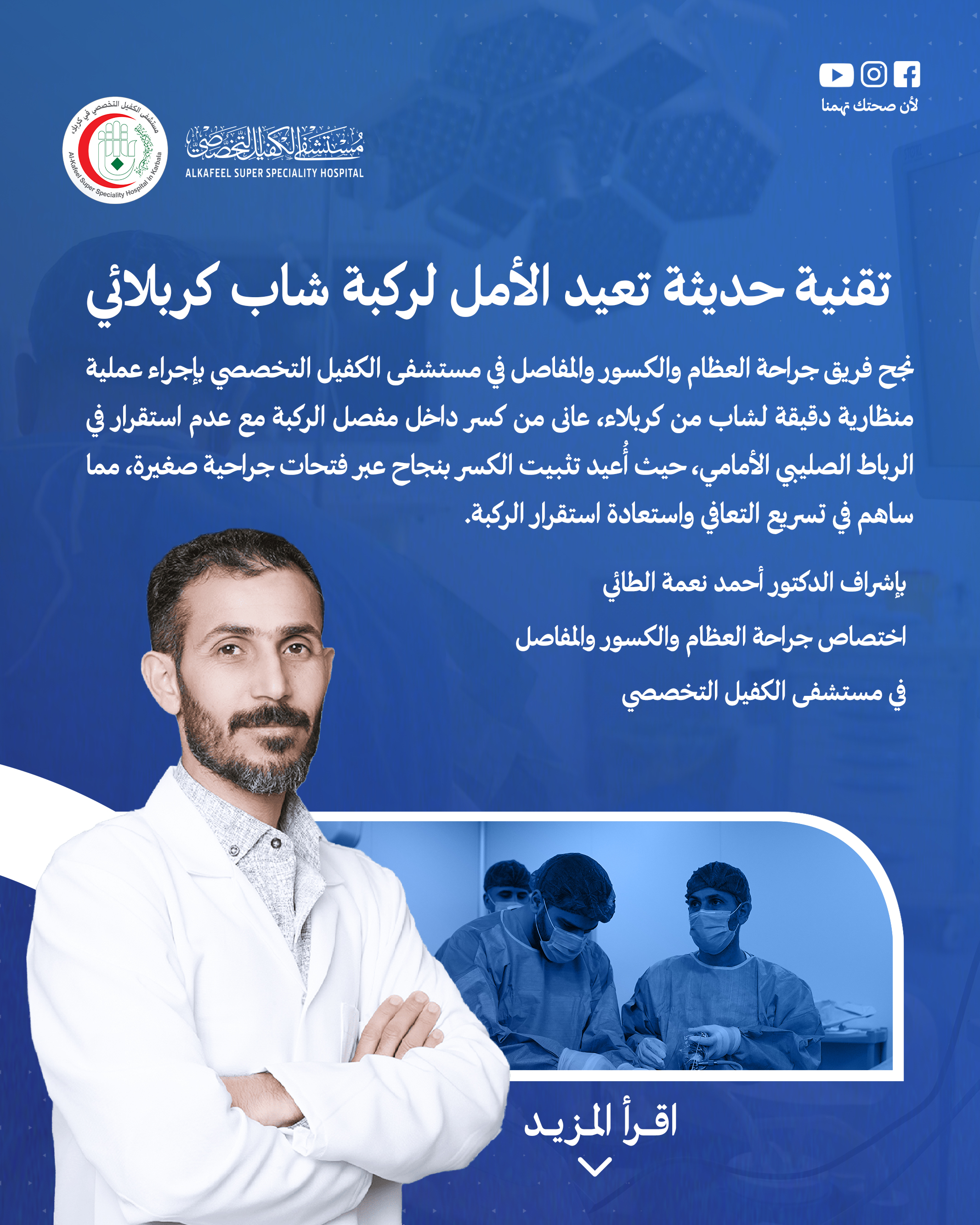وذكر الدكتور أحمد نعمة الطائي، إجراء عملية جراحية معقدة لشاب يبلغ من العمر 22 عاماً من كربلاء، كان الشاب يعاني من كسر داخل مفصل الركبة مصحوبًا بعدم استقرار في الرباط الصليبي الأمامي، وهو نوع من الكسور المعروف بتعقيده ومخاطره على استقرار الركبة.