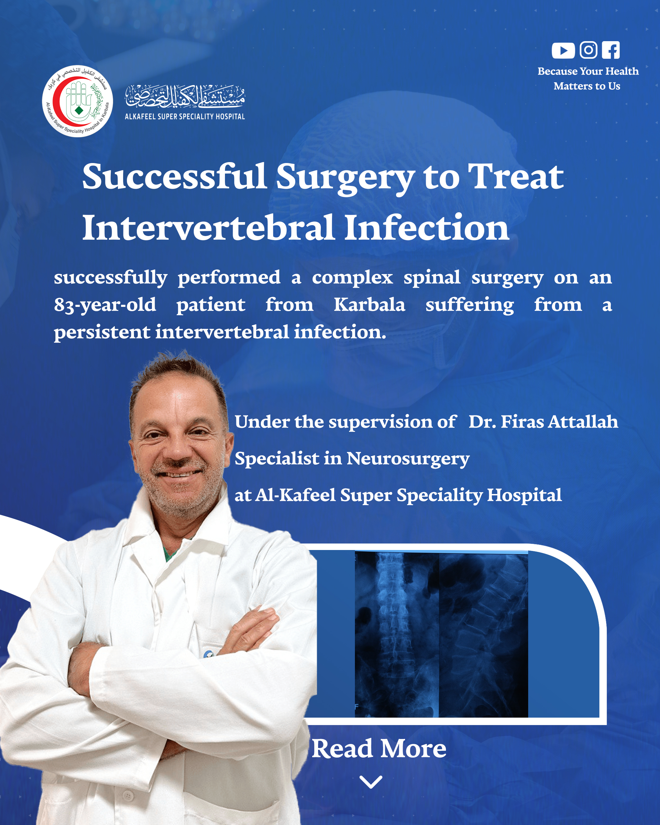 A specialized neurosurgery team at Alkafeel Hospital has successfully performed a complex spinal surgery on an 83-year-old patient from Karbala suffering from a persistent intervertebral infection.