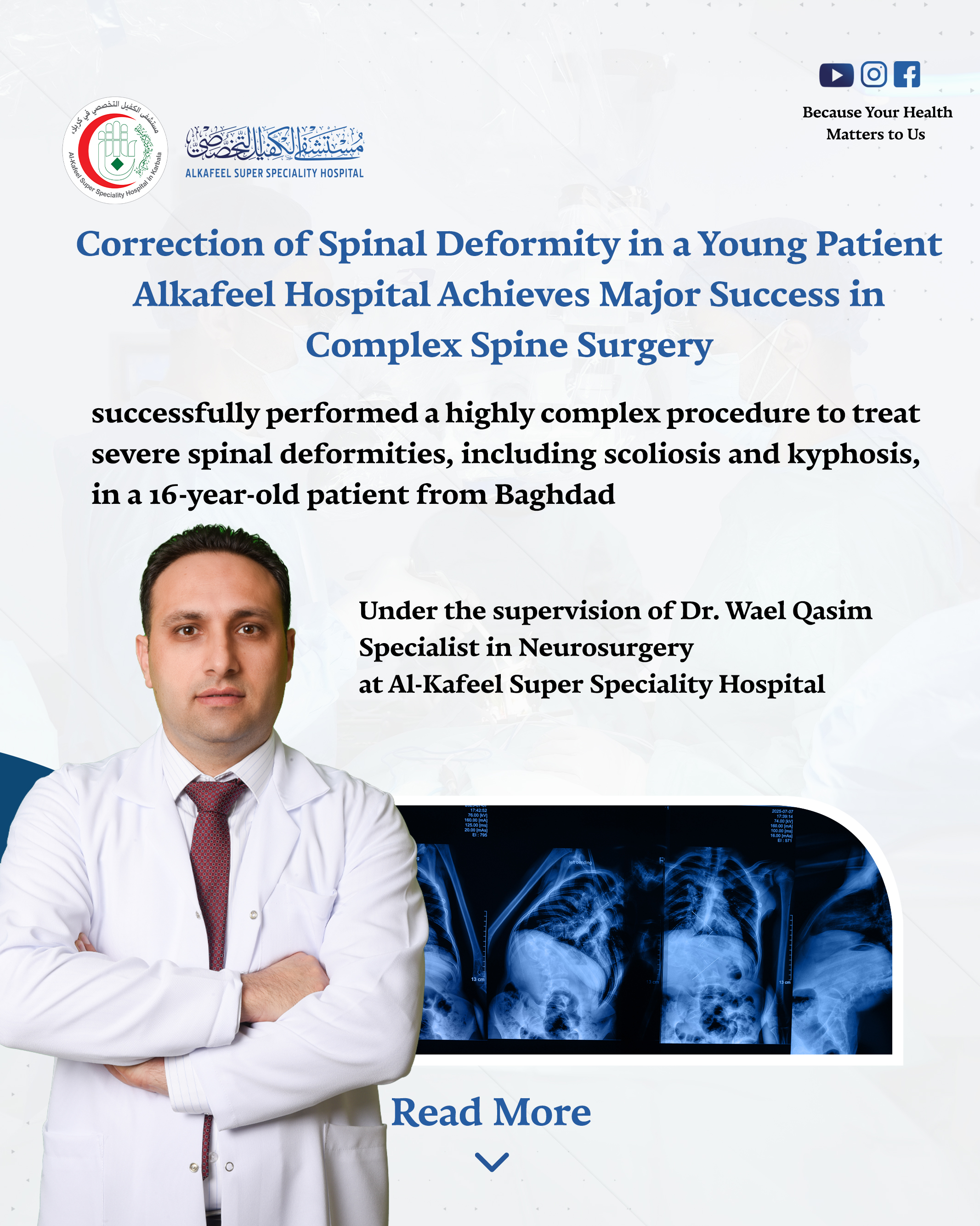A specialized spine surgery team at Alkafeel Hospital has successfully performed a highly complex procedure to treat severe spinal deformities, including scoliosis and kyphosis, in a 16-year-old patient from Baghdad.