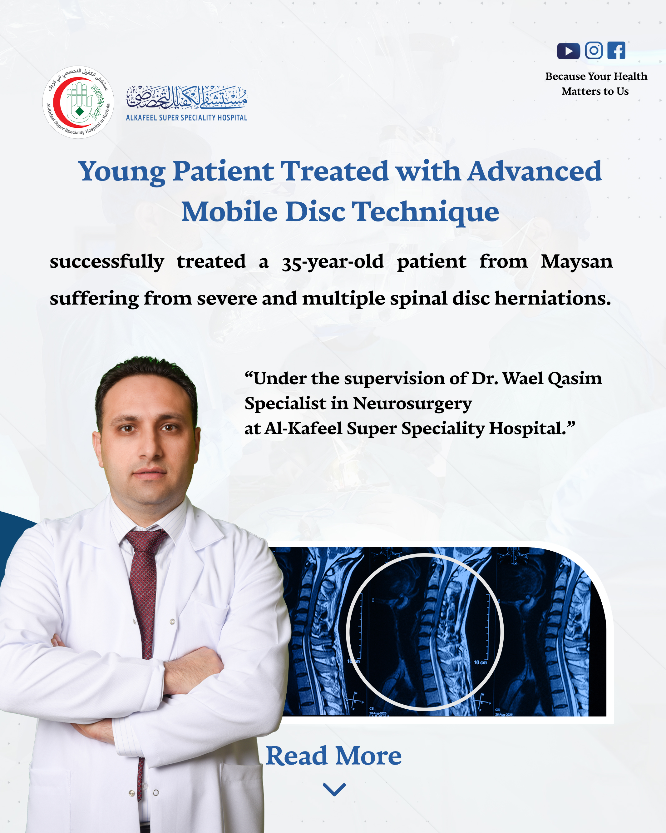 A specialized spinal surgery team at Alkafeel Hospital successfully treated a 35-year-old patient from Maysan suffering from severe and multiple spinal disc herniations.