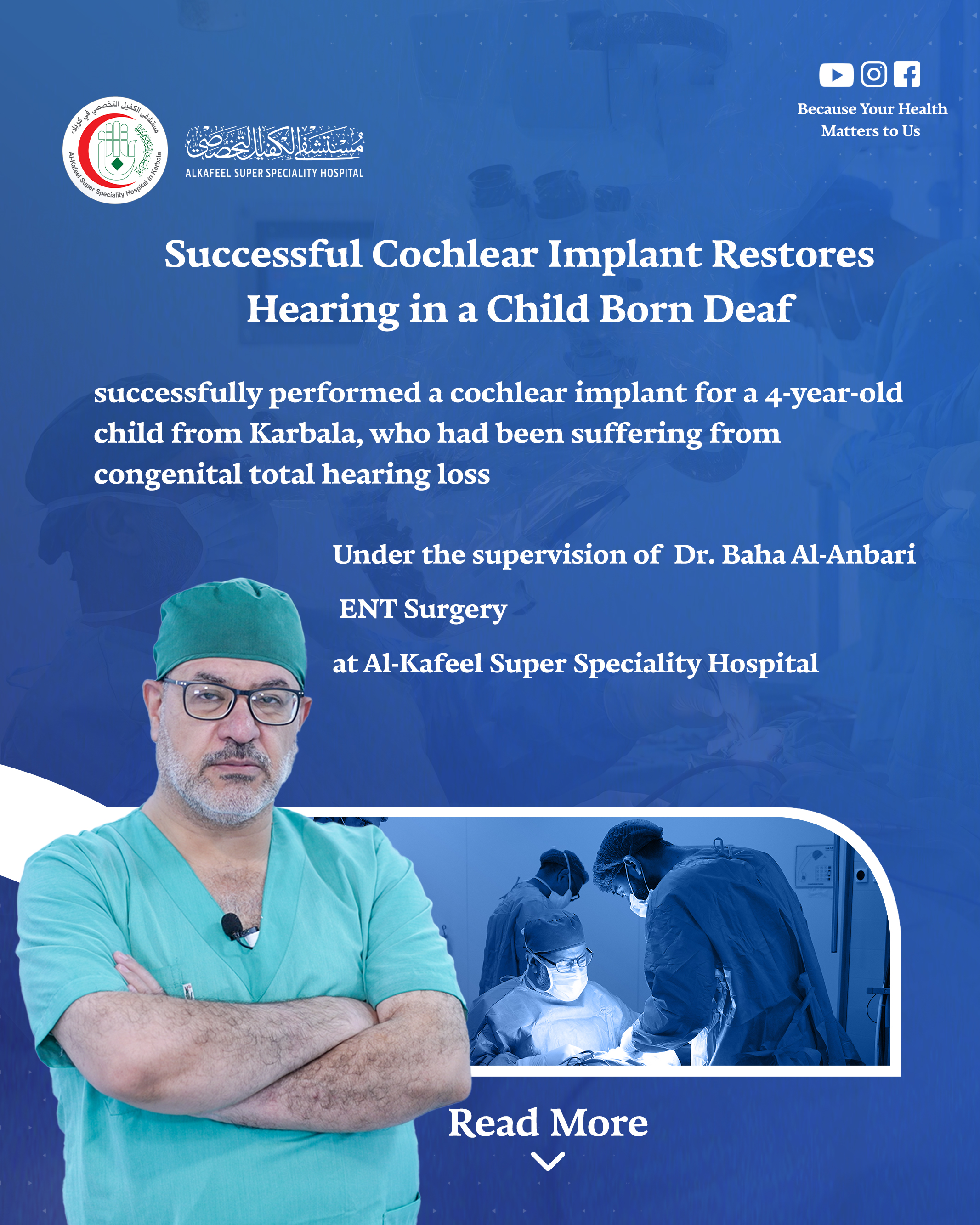 A specialized otolaryngology (ENT) team at Alkafeel Hospital successfully performed a cochlear implant for a 4-year-old child from Karbala, who had been suffering from congenital total hearing loss.