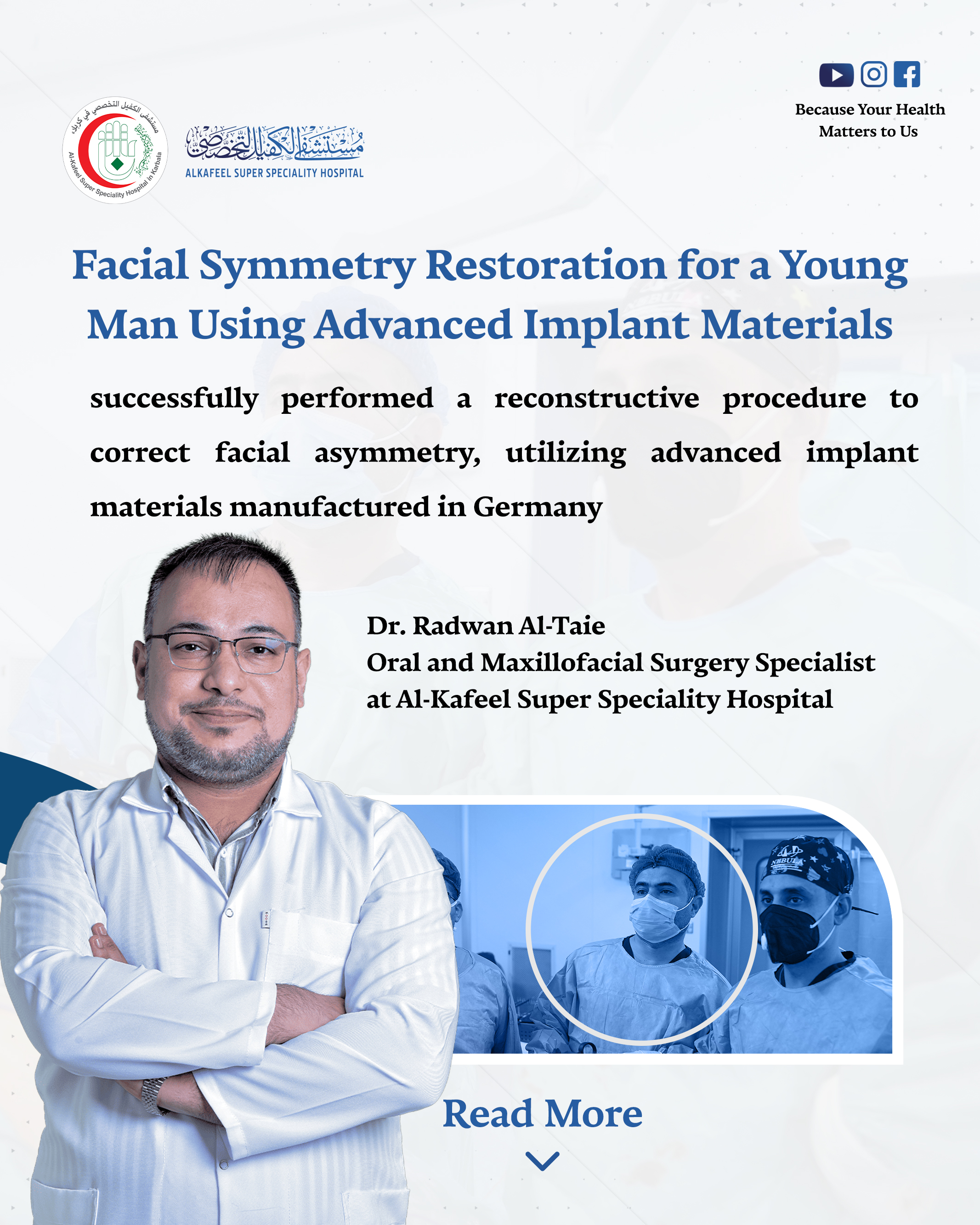 A specialized team in maxillofacial surgery at Alkafeel Hospital has successfully performed a reconstructive procedure to correct facial asymmetry, utilizing advanced implant materials manufactured in Germany.