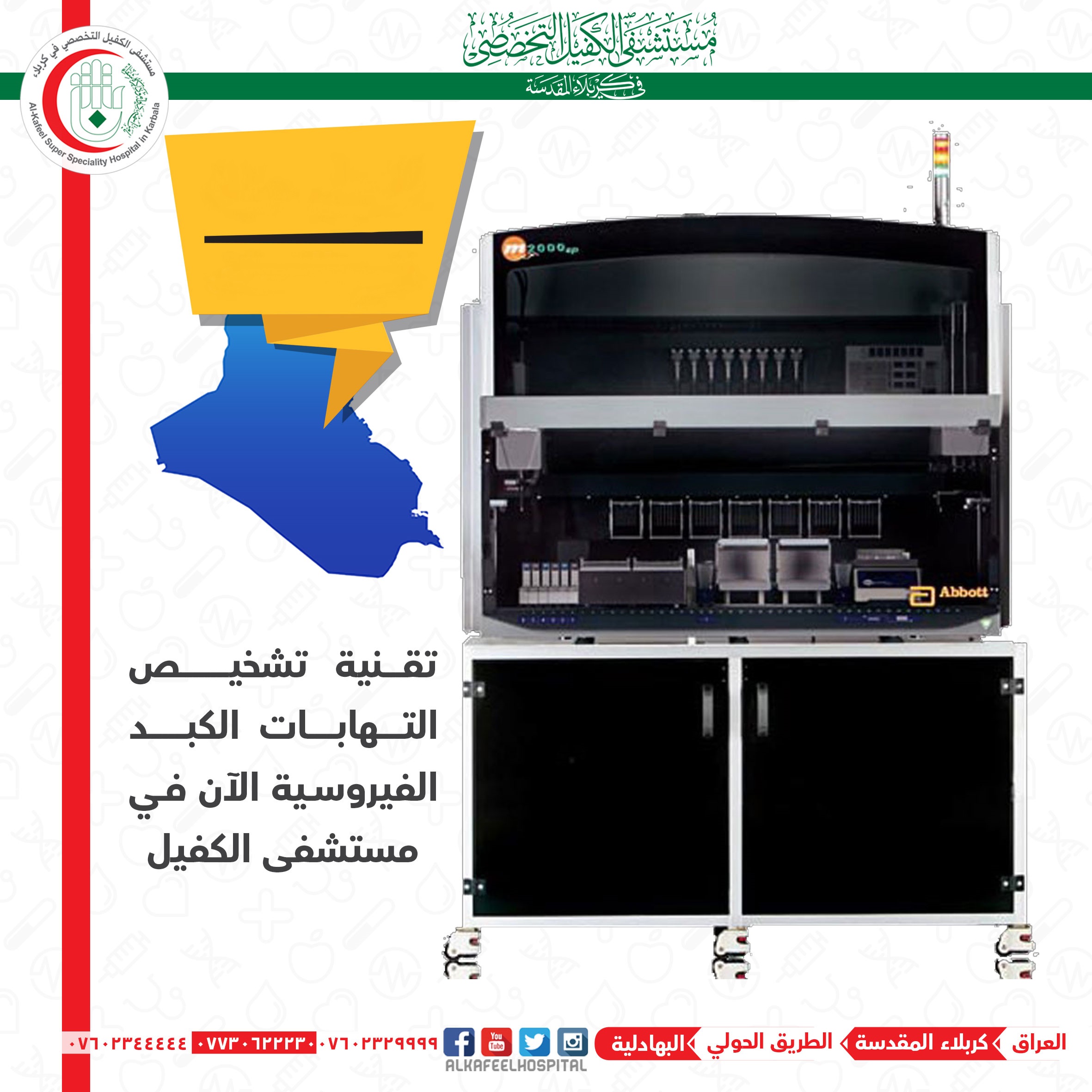 اعلن قسم المختبرات في مستشفى الكفيل التخصصي بكربلاء عن امتلاكه تقنية (Abbott Real Time PCR)  التي تعمل على تشخيص أمراض الكبد الفيروسية بأنواعها.