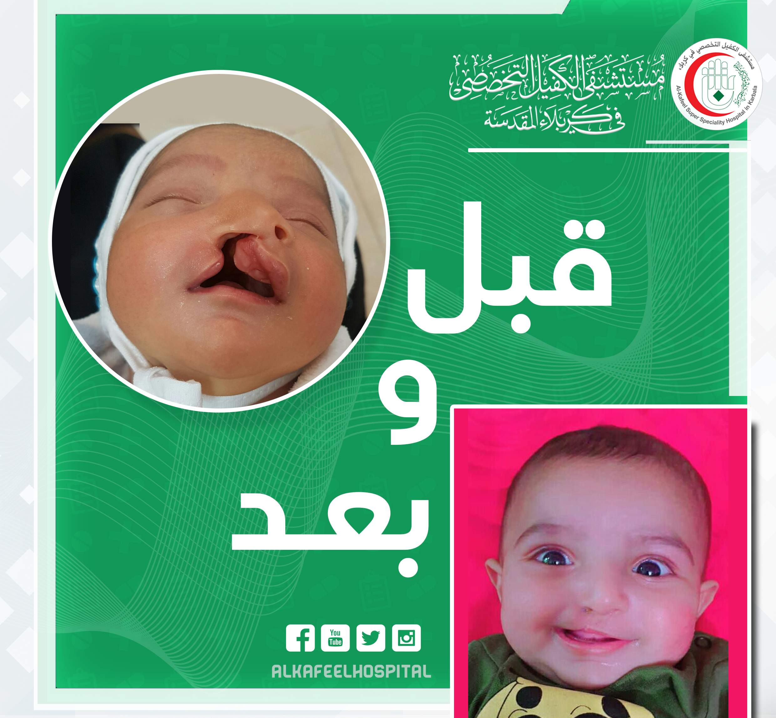 أعلن فريق طبي مختص بجراحة الوجه والفكين في مستشفى الكفيل التخصصي بكربلاء، نجاحه بمعالجة طفل بعمر ثلاثة أشهر يعاني من شق الشفة واللهاة الولادي مع وجود فتحة في الفك الاعلى.