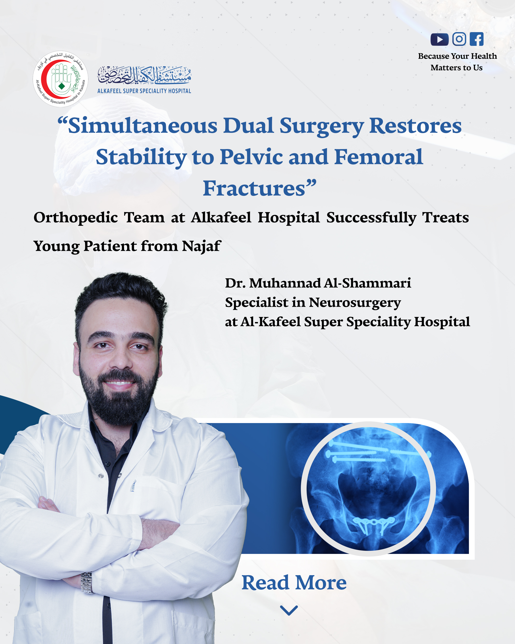 A specialized orthopedic, trauma, and joint surgery team at Alkafeel Hospital has successfully performed a complex dual surgical procedure to treat an unstable fracture of the pelvis and femur in a young patient from Najaf.