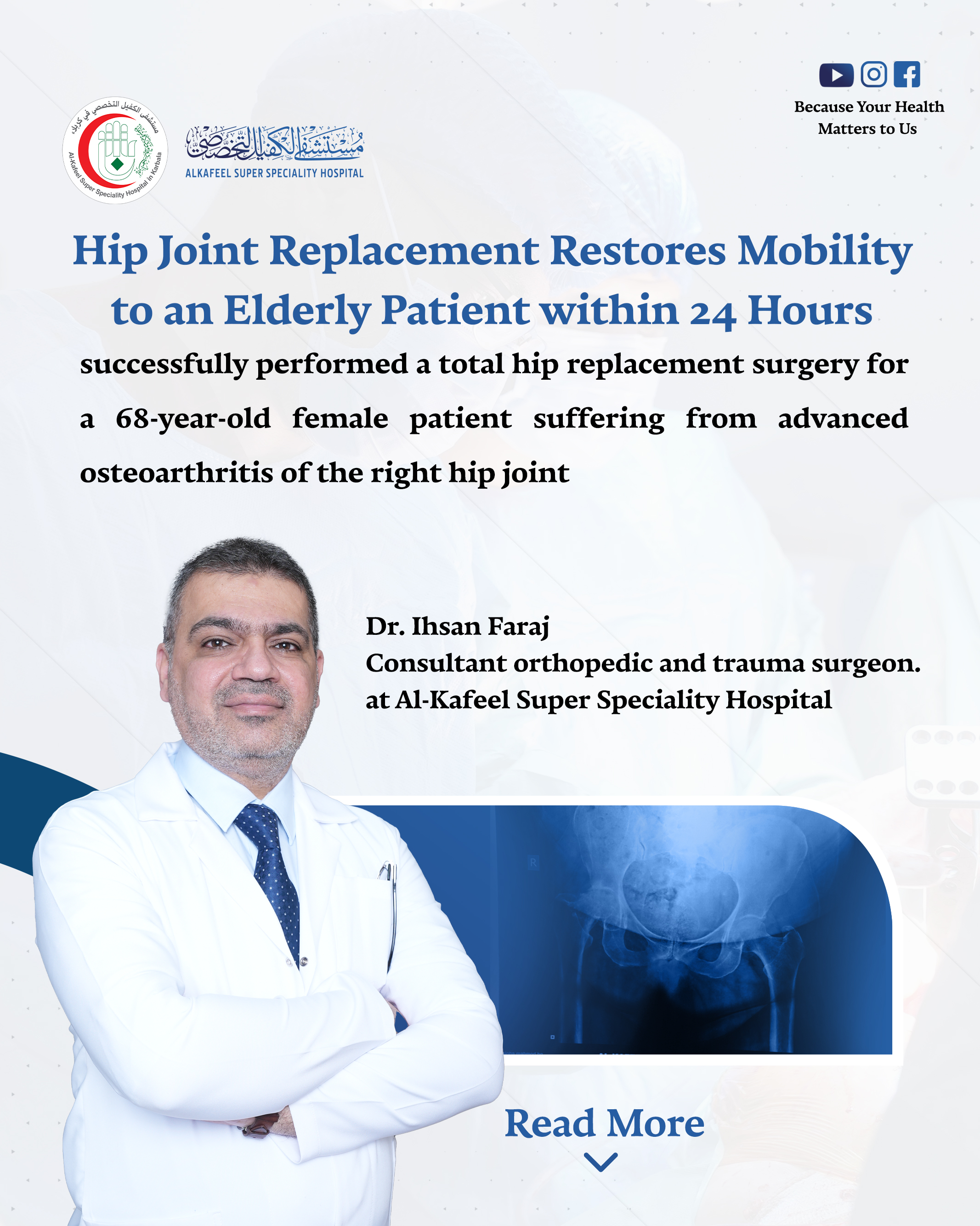 A specialized orthopedic and joint surgery team at Alkafeel Hospital in Karbala successfully performed a total hip replacement surgery for a 68-year-old female patient suffering from advanced osteoarthritis of the right hip joint.