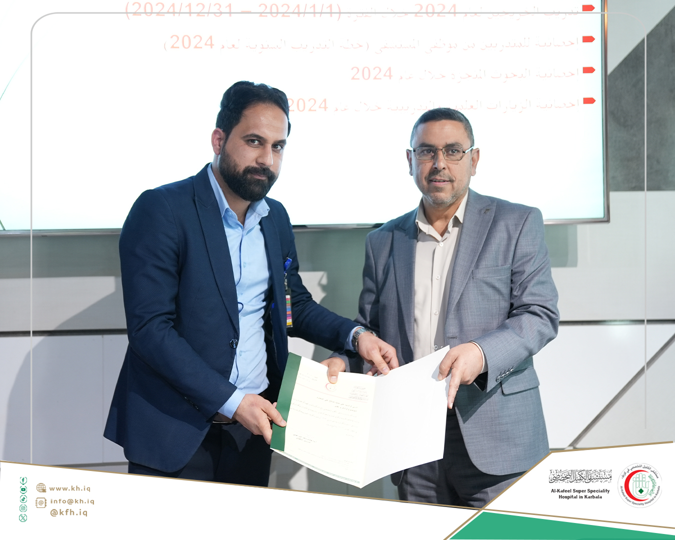 وأضاف النصراوي، إن عدد ممن إشتركوا بتدريباتنا من موظفي المستشفى بلغ (752) موظفاً، تدربوا بنحو (24) تخصصاً ضمن تخصصات أقسام وشعب المستشفى المختلفة، وساهمنا بإنجاز (20) بحثاً أكاديميا في الدراسات الأولية والعليا بتخصصات طبية ومختبرية ومالية وتقنية مختلفة لباحثين من جامعات بغداد وبابل وكربلاء ووارث الأنبياء والزهراء والعميد، إضافة إلى جامعة صفاقص من تونس وجامعة إيران للعلوم الطبية، مردفاً إنه في جانب الزيارات العلمية والتدريبية إستقبلنا (1390) طالباً وطالبة من جامعات وكليات حكومية وأهلية من كربلاء ومحافظات أخرى، بمختلف التخصصات التي ترتبط بتقديم الخدمات في القطاع الصحي.