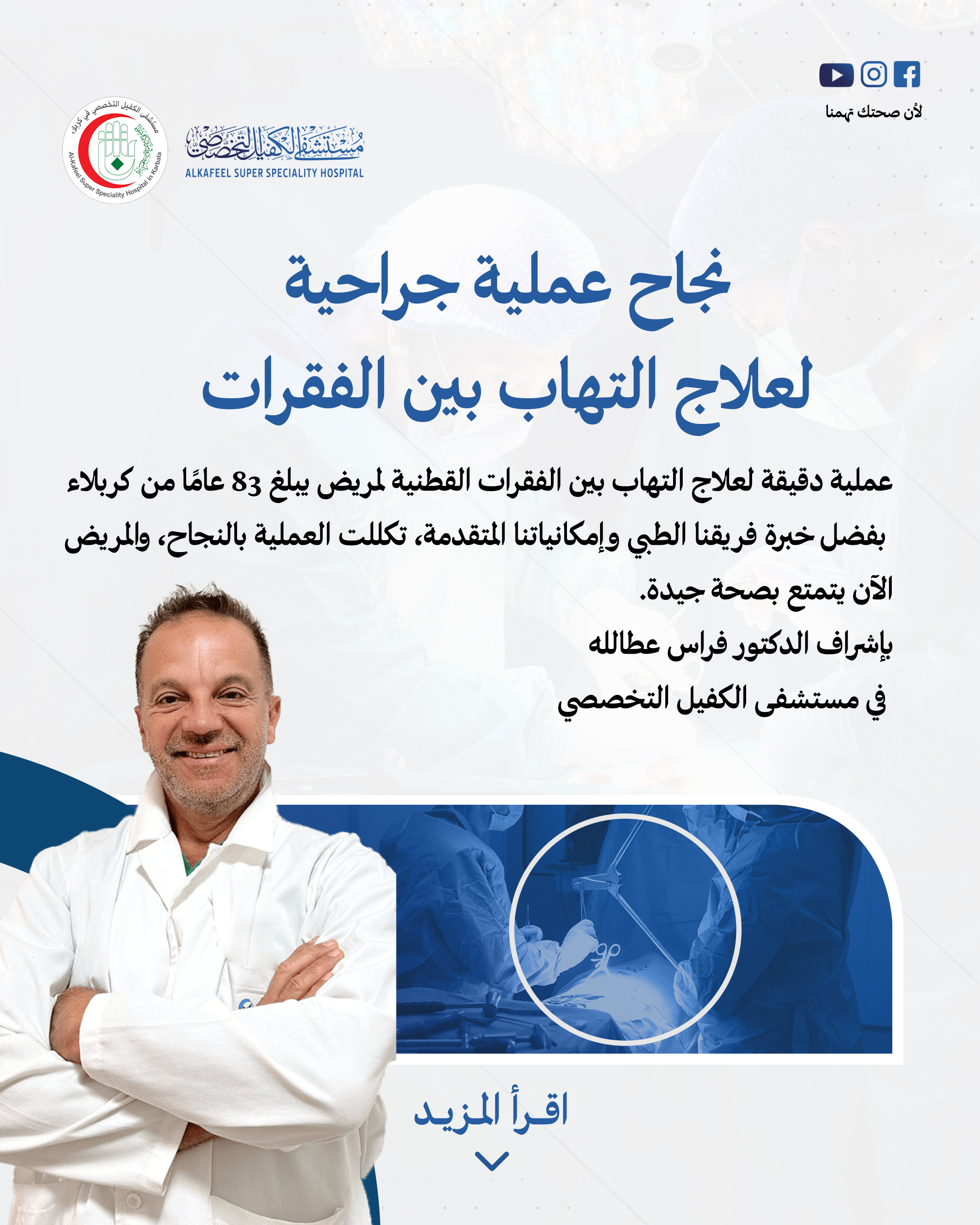 وأوضح عطالله، انه بفضل الإمكانيات المتوفرة في مستشفى الكفيل، تم إجراء عملية جراحية ناجحة لتثبيت الفقرات ورفع الالتهابات، مؤكدا نجاح العملية والمريض الآن في حالة صحية جيدة.