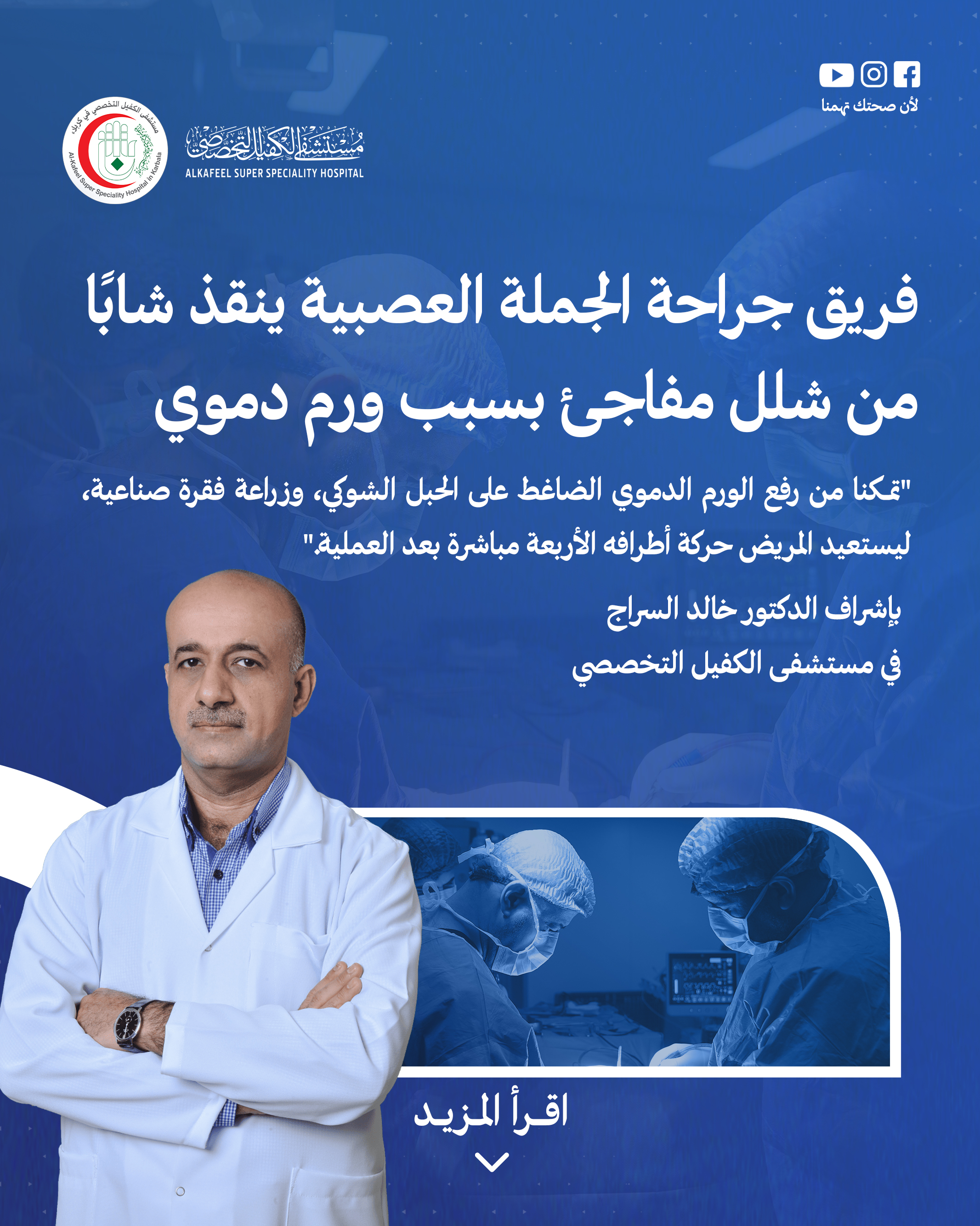 وأكد السراج ان العملية تمت بنجاح، والشاب عقبها مباشرة استعاد حركة أطرافه الأربعة، مستطردا حديثه بان الحمد لله تمكنا من إنقاذ الشاب بفضل توفر الإمكانيات في مستشفى الكفيل، فالحالة كانت صعبة جدًا، وتمت السيطرة على النزيف الحاصل بسبب الورم الدموي، وهذا كله بفضل تقنيات مستشفى الكفيل.