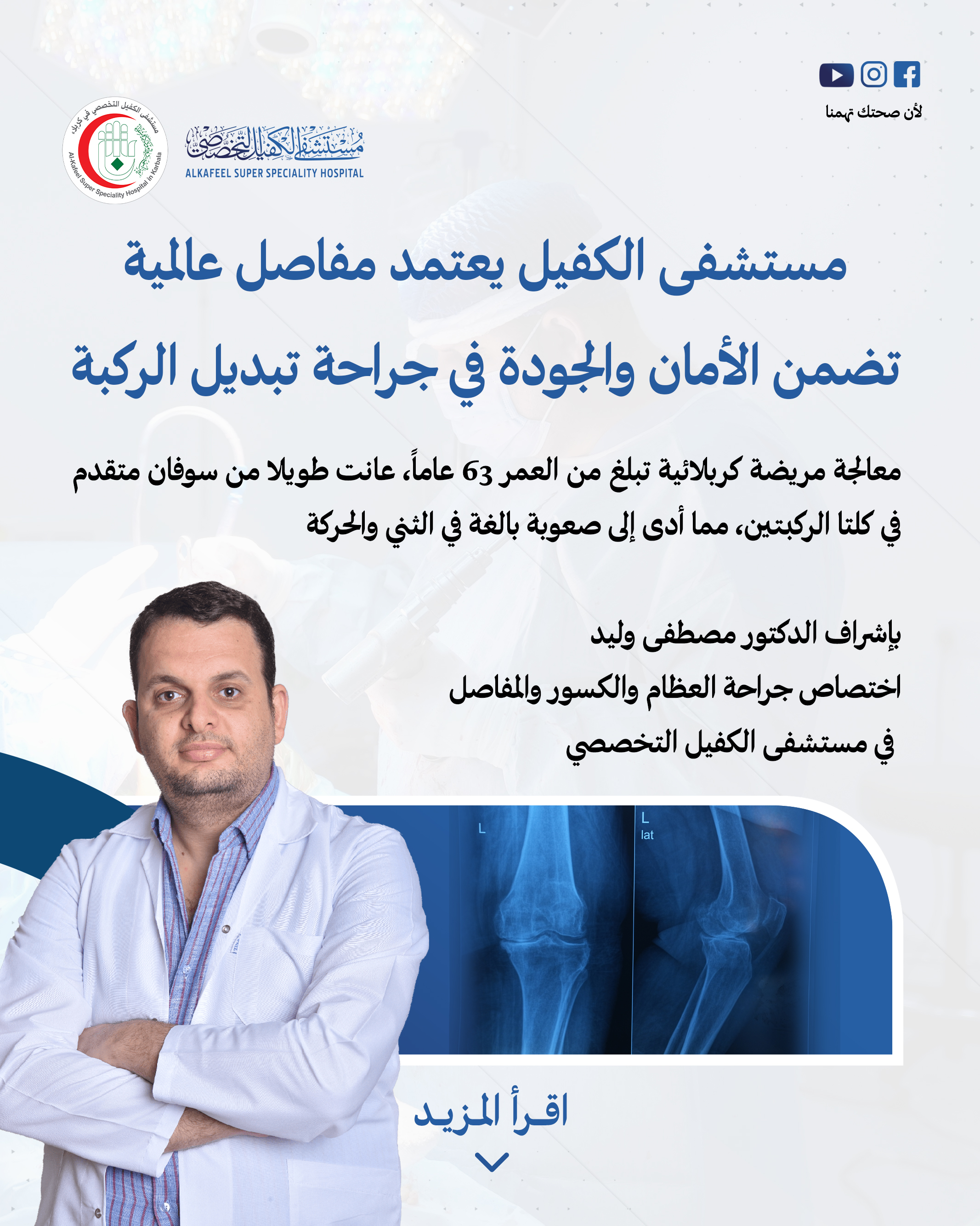 نجح فريق طبي متخصص بجراحة العظام والكسور والمفاصل في مستشفى الكفيل، من معالجة مريضة كربلائية تبلغ من العمر 63 عاماً، عانت طويلا من سوفان متقدم في كلتا الركبتين، مما أدى إلى صعوبة بالغة في الثني والحركة.وذكر الدكتور مصطفى وليد، انه بعد التشخيص الدقيق للحالة، قررنا إجراء عملية تبديل مفصل الركبة الكامل، وهو إجراء جراحي معقد يتطلب خبرة عالية وتقنيات حديثة، مبينا استخدمنا في العملية مفاصل من النوعيات الرصينة ذات الشركات العالمية المعروفة، والتي توفرها مستشفى الكفيل، مما يضمن الجودة والأمان للمريض.وأكد وليد، ان العملية كانت ناجحة وتم البدء في اليوم التالي مباشرة برامج العلاج الطبيعي والمشي التدريجي، بهدف استعادة وظيفة المفصل وتحسين جودة حياة المريضة بشكل سريع وفعال.