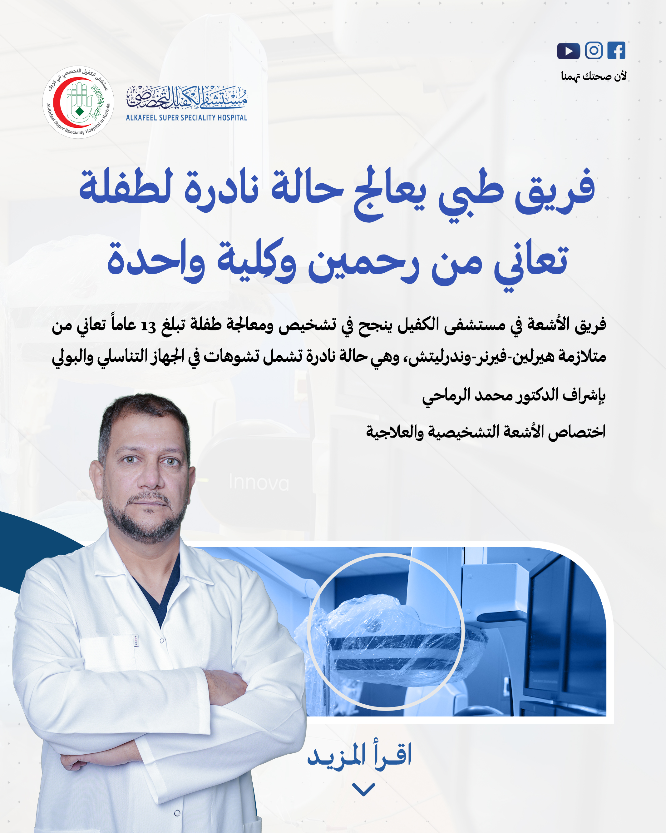وأضاف اختصاصي الاشعة، لم تقتصر التشوهات على الجهاز التناسلي، حيث أظهر مفراس البطن أن المريضة تمتلك كلية واحدة فقط، مع عدم تكون الكلية اليسرى لديها ولادياً، وهذه الظاهرة مجتمعة تُعرف علمياً بـ "متلازمة هيرلين-فيرنر-وندرليتش" (Herlyn-Werner-Wunderlich syndrome - HWW)، وهي حالة نادرة جداً تجمع بين تشوهات الجهاز التناسلي والجهاز البولي.