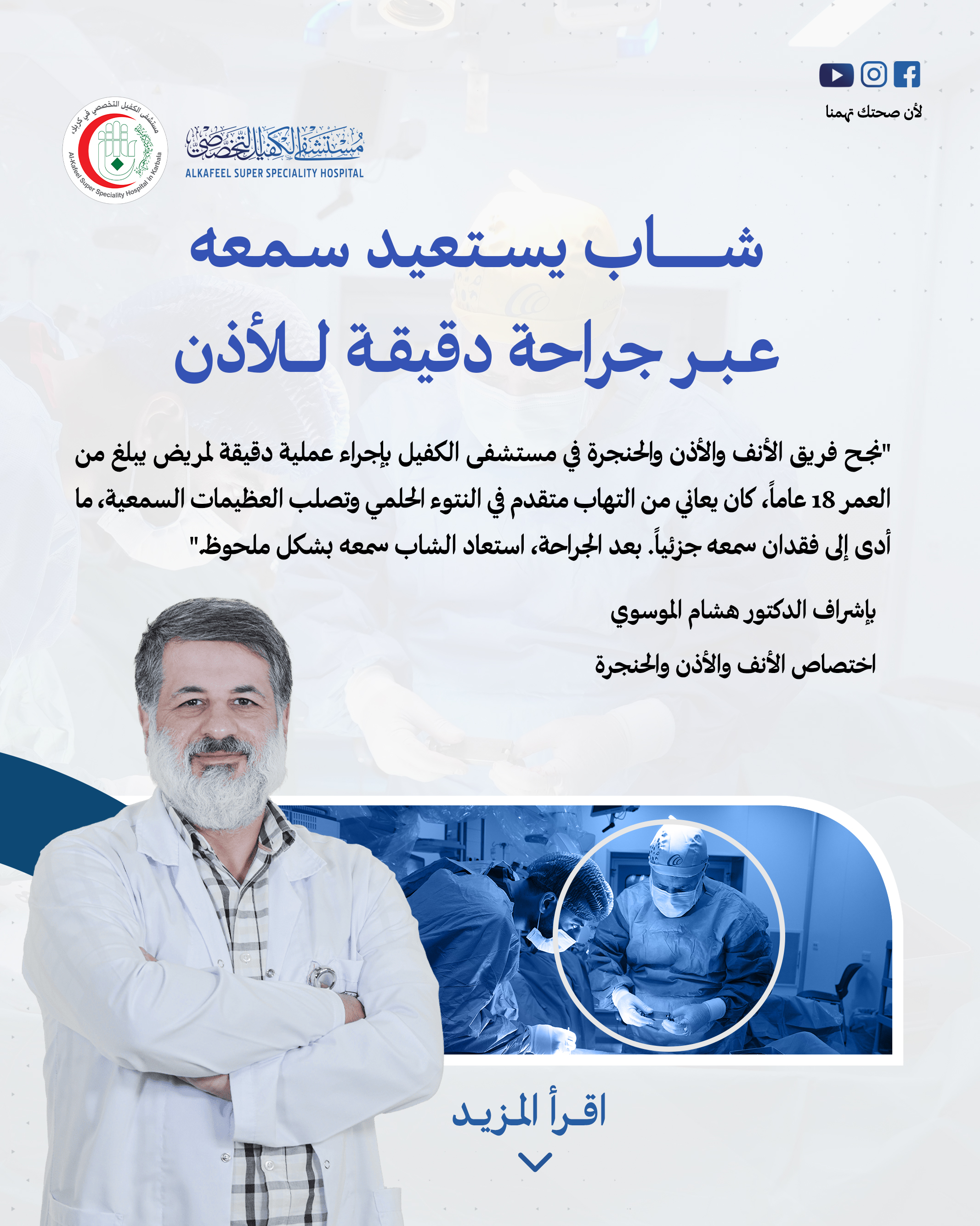 وعد جراح الانف والاذن والحنجرة هذه العملية مثالاً على دقة الجراحات التي تُجرى في مستشفى الكفيل التخصصي، وقدرة الفريق الطبي على التعامل مع الحالات المعقدة واستخدام تقنيات مبتكرة لاستعادة وظائف حيوية للمرضى، وقد استعاد المريض قدرته على السمع بفضل هذه الجراحة الناجحة.
