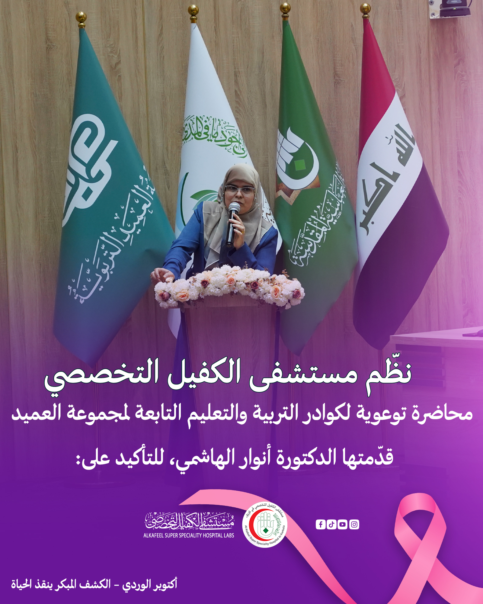 في إطار فعاليات شهر أكتوبر الوردي، المخصص للتوعية بسرطان الثدي، وضمن جهود مستشفى الكفيل التخصصي لدعم النشاط الطبي الصحي ونشر الثقافة الطبية، قدمت الدكتورة أنوار الهاشمي، اختصاصية الكشف المبكر لأمراض وسرطان الثدي، محاضرة توعوية شاملة استهدفت كوادر التربية والتعليم.