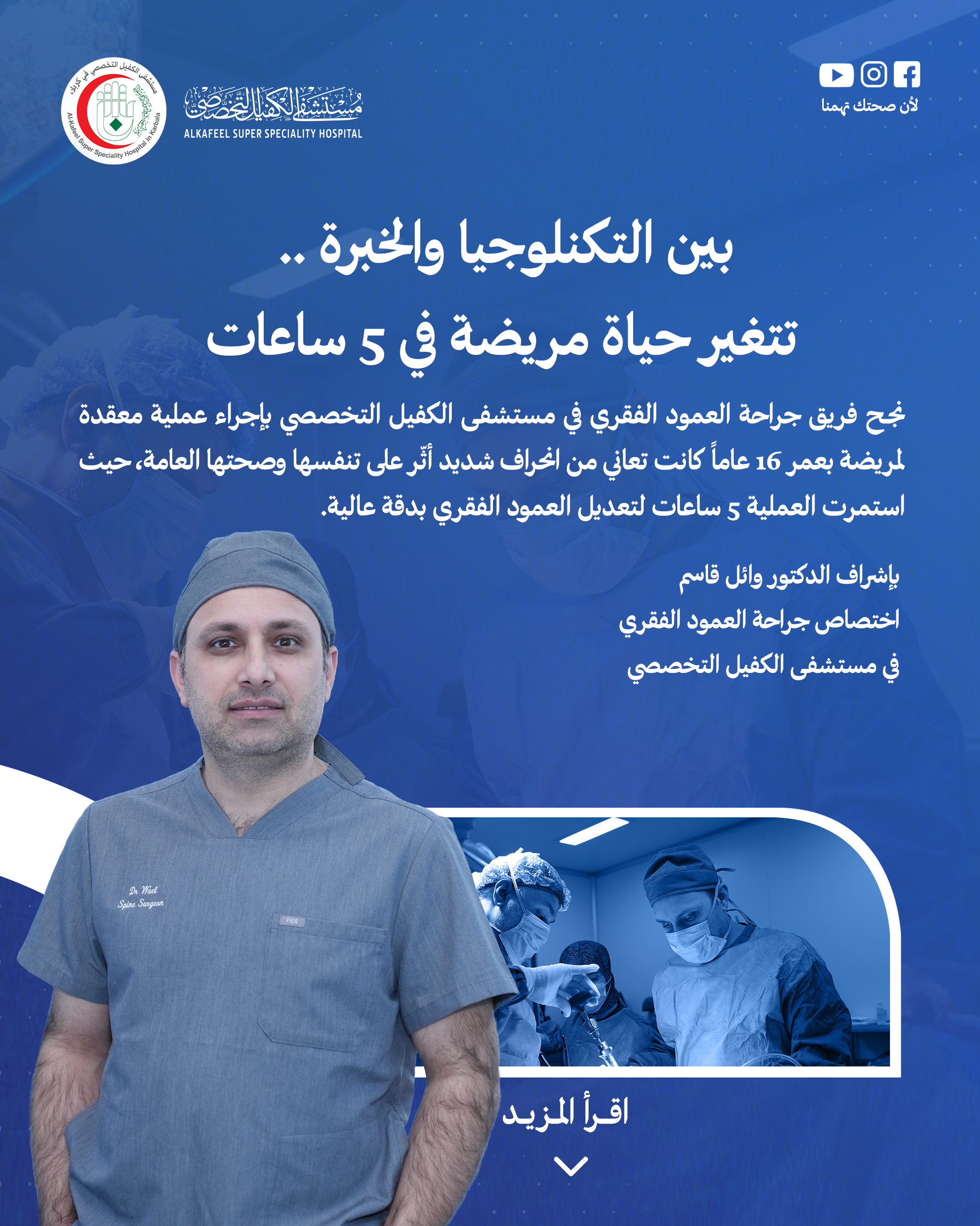 لكن هنا في مستشفى الكفيل التخصصي كانت لدينا رؤيا مختلفة، فنحن نمتلك فريقا من الجراحين وأطباء التخدير ذوي خبرة عالية جدا، مدعومين بوحدات عناية مركزة متطورة لما بعد العمليات.